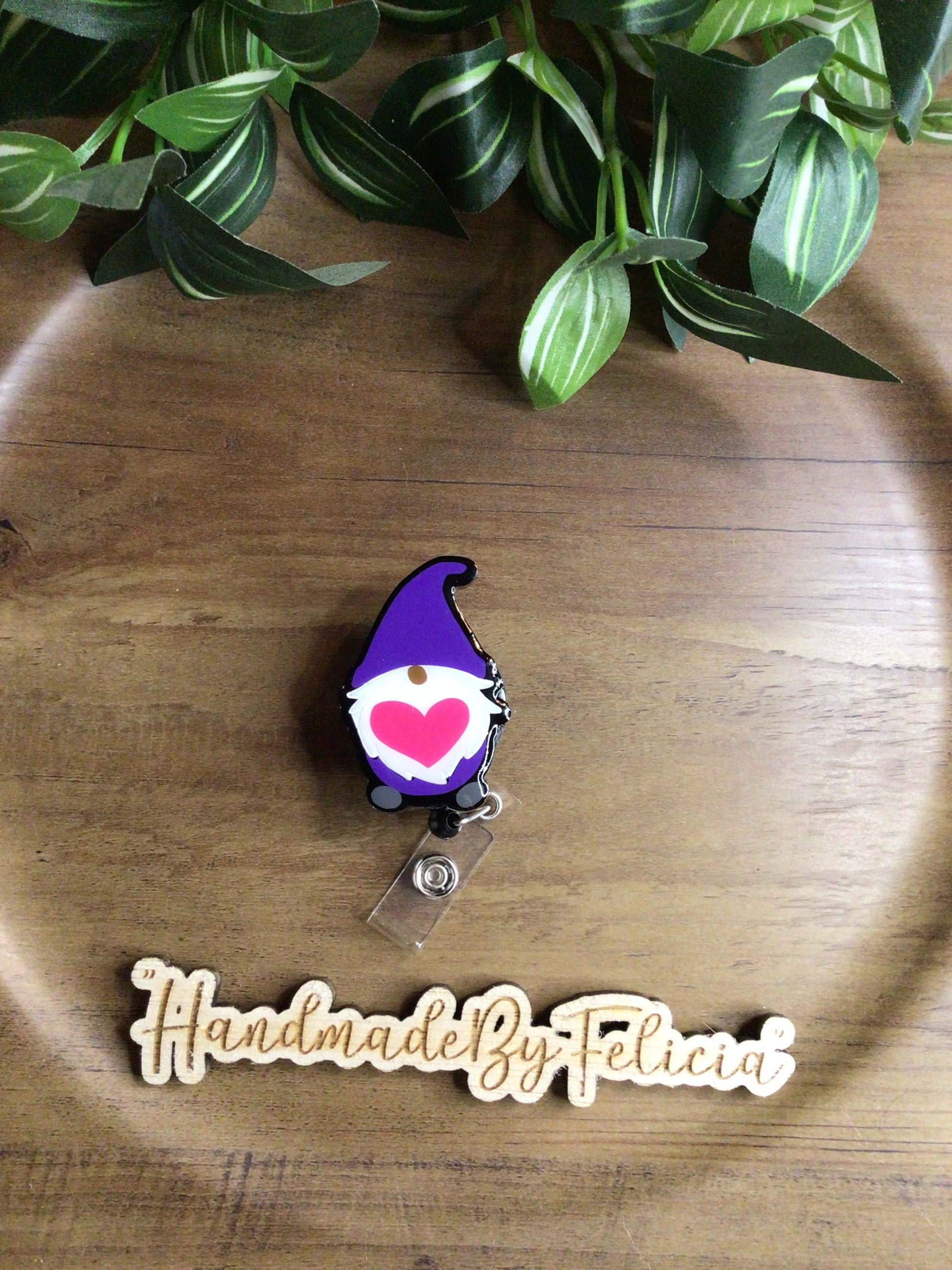 Pink heart gnome acrylic badge reel