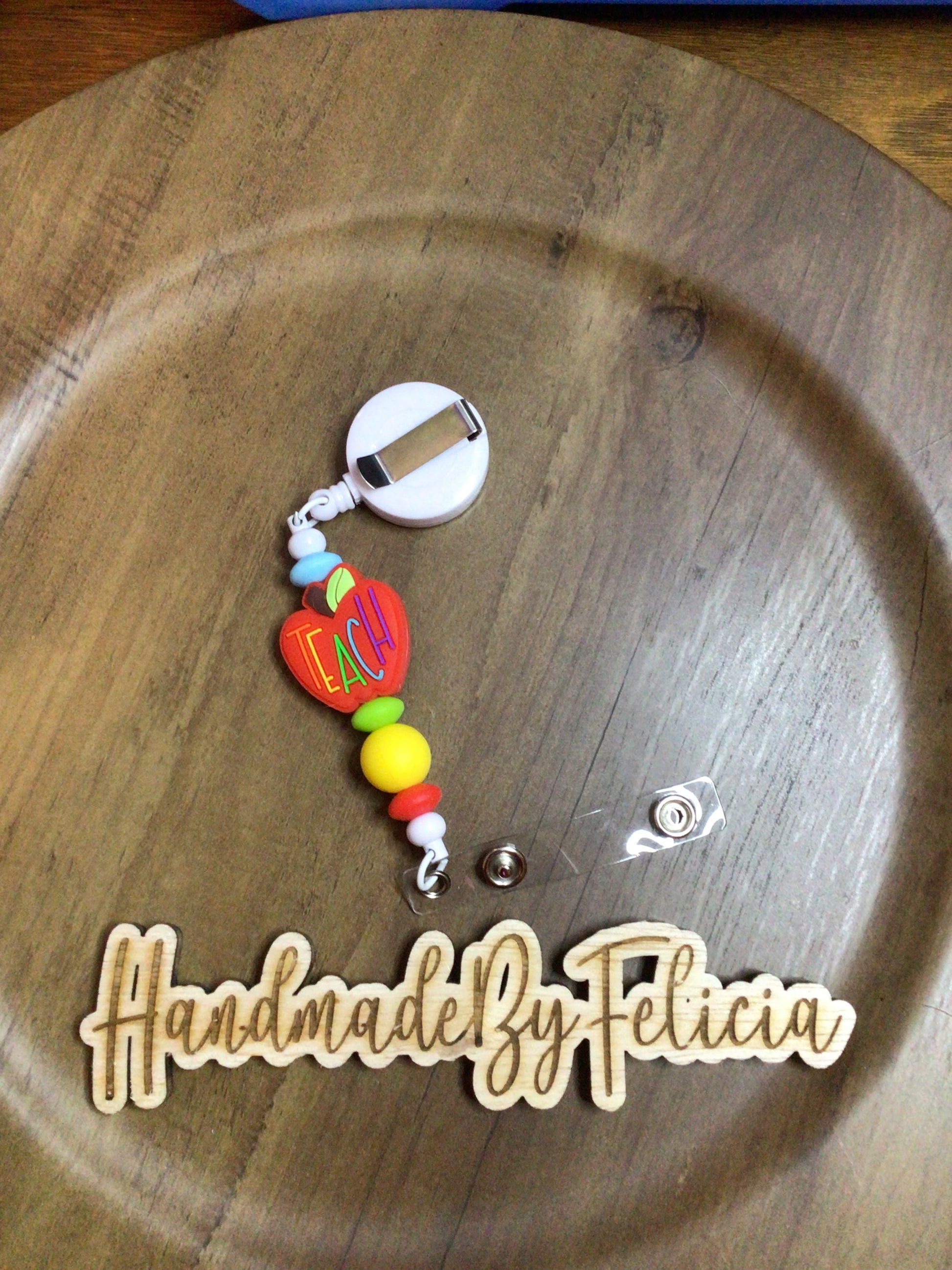 Red apple teacher badge reel, white