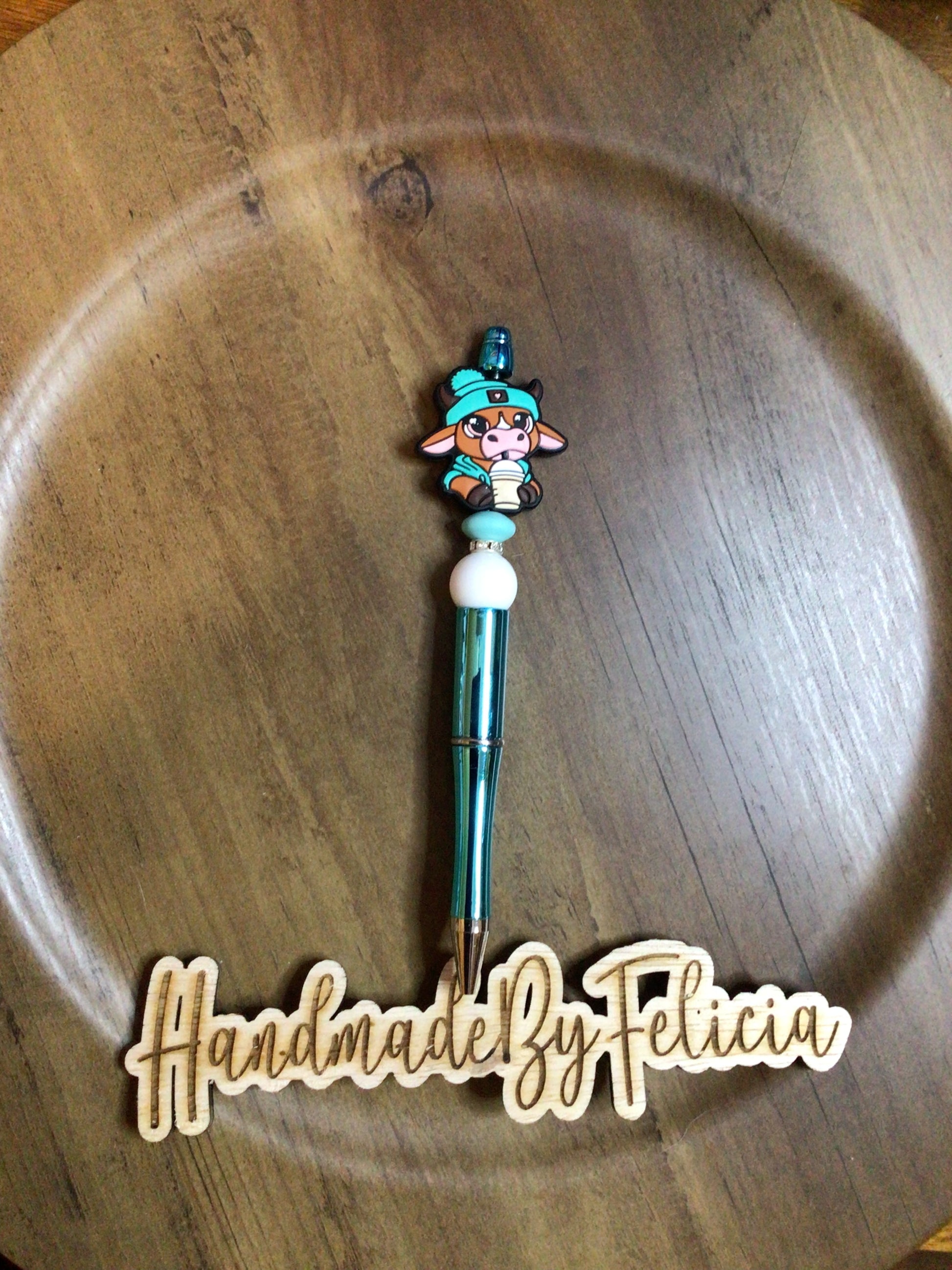 Turquoise cow with drink shiny pen